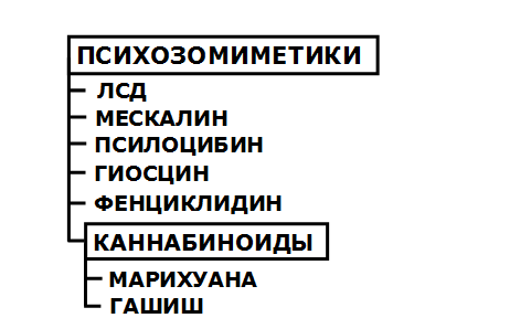 Рисунок 15.1. Психозомиметики Действие. Нарушают восприятие окружающего мира, напоминающего грезы. Люди видят яркие, цветные объекты окружающей среды с пластичным постоянным изменением формы и цвета. Человек не способен принять нормальное решение. Мешают рациональному мышлению. ЛСД(диэтиламид лизергиновой кислоты). Происхождение. Не встречается в природе. Полусинтетическое соединение. Строение. Напоминает алкалоиды спорыньи. Механизм действия. 1. Возбуждает 5-HT1а и 5-НТ1с рецепторы в ЦНС. Это приводит к галлюцинациям. 2. Блокирует 5-НТ2 рецепторы. 3. Ускоряет метаболизм серотонина в ЦНС до 5-гидроксииндолуксусной кислоты. Действие 1. Соматические эффекты. Головокружение, мышечная слабость, тремор, тошнота, парестезии. 2. Перцептивные эффекты (нарушения восприятия). Затуманенность зрения, искажение перспективы, оформленные зрительные и аморфные слуховые галлюцинации. Предметы воспринимаются в розовом цвете. Изменяется восприятие времени. 3. Психические эффекты. Нарушения памяти, затрудненность мышления, лабильность настроения. 4. Другие эффекты. Напоминают гиперактивность ЦНС и симпатической системы: тремор, беспокойство, расширение зрачков, тахикардия, тахипноэ, ↑ АД, гипертермия. Развивается толерантность и физическая зависимость. ЛСД– высокоактивное соединение. Действует в дозе 1-2 мкг/кг. Его эффективность при пероральном и парентеральном применении почти одинакова, поэтому принимают почти всегда через рот. Для устранения галлюцинаций, вызванных ЛСД, применяют нейролептики (чаще галопидол). Мескалин Источник. Некоторые кактусы Мексики. Действие. См. ЛСД. Развивается быстро. Длится несколько часов. Проявления могут варьировать в зависимости от особенностей личности, ожидаемого действия и обстановки. Типично волнообразное течение. Псилоцибин Источник. Некоторые грибы Мексики. Действие. Напоминает норэпинефрин, дофамин, серотонин. Date: 2015-07-01; view: 447; Нарушение авторских прав |
