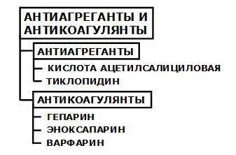Рисунок 18.7. Антиагреганты и антикоагулянты, применяемые при хронических нарушениях мозгового кровообращения Антиагреганты (кислота ацетилсалициловая, тиклопидин), антикоагулянты (гепарин, эноксапарин, варфарин). См. «Лекарственные средства, влияющие на систему крови».