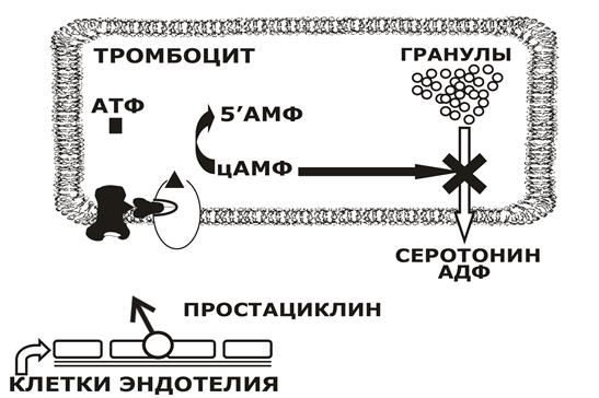 Рисунок 23.4. Ингибирование тромбоцита простациклином 2. ↓ В плазме тромбина и тромбоксана А2. Мембрана тромбоцитов содержит и другие рецепторы. Они связывают: 1) тромбин (превращает фибриноген в фибрин), 2) тромбоксан А2, 3) коллаген, 4) фибриноген. Возбуждение этих рецепторов запускает высвобождение из тромбоцитов серотонина и АДФ. Наступает агрегация. [Примечание. В интактном сосуде уровень тромбина и тромбоксана А2 низкий. Интактный эндотелий экранирует коллаген субэндотелия. Коллаген не взаимодействует с рецепторами тромбоцитов. Агрегация не начинается]. Химические сигналы, способствующие агрегации тромбоцитов: 1) ↓ в плазме простациклина, 2) обнажённый коллаген субэндотелия, 3) ↑ в плазме тромбоксана А2.
