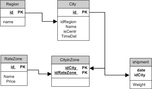 База данных «Post» База данных содержит необходимые сведения, на основе которых можно рассчитать стоимость доставки груза из Самары в любой город Российский Федерации. Вся страна поделена на тарифные зоны по географическому расположению. В тарифные зоны включены только те города, которые являются центрами своих регионов. Тарифная зона населенного пункта регионального значения определяется по тарифной зоне центра региона. БД содержит таблицы (рис. 1): - Region – регионы России (id – идентификатор региона, Name – наименование региона); - City – перечень городов, в которые осуществляется доставка груза (id – идентификатор города, idRegion –регион (внешний ключ), Name – наименование города, isCentr – является ли город центром региона, TimeDel – сроки доставки); - RateZone – список тарифных зон (id – идентификатор тарифной зоны, Name – наименование тарифной зоны); - CityinZone – распределение городов по тарифным зонам (idCity – идентификатор города (внешний ключ), idRateZone – идентификатор тарифной зоны (внешний ключ)); - Shipment – список отправлений (date – дата отравления, idCity – идентификатор города (внешний ключ), Weight – вес отправления).