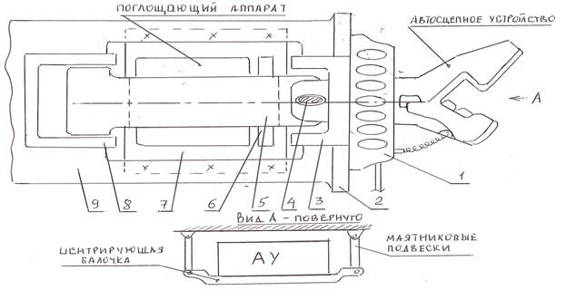 Автосцепное устройство вставляется в ударную розетку 1 приваренную к концевой балке 2 рамы вагона, с которой наглухо связан передний упор 3 (иногда его отливают заодно с ударной розеткой). Через клин 4 автосцепное устройство соединяется с тяговым хомутом 5 в прямоугольном пазу которого размещается поглощающий аппарат и упорная плита 6. Комплекс УТП заканчивается задним упором 8 размещенным в хребтовой балке 9, к которой снизу под тяговым хомутом прикрепляют планку 7 поддерживающую его. На виде А видно, что автосцепное устройство опирается в вертикальной плоскости на центрирующую балку, которая висит на двух маятниковых подвесках, что позволяет АУ свободно отклоняться в горизонтальной плоскости. При этом надежное сцепление обеспечивается даже при относительном вертикальном смещении автосцепок на 100мм у грузовых и 50мм у пассажирских вагонов и при горизонтальном смещении до 175мм. Немного подробнее остановимся на основных частях УТП.