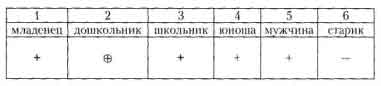Начиная с 5 лет дети уже не делают ошибок при идентификации своего реального половозрастного статуса. Дети этого возраста могут правильно построить последовательность идентификации: младенец - дошкольник - школьник. Около половины из них продолжают построение последовательности и идентифицируют себя с будущими ролями юноши (девушки), мужчины (женщины), правда, называя последних "папа" и "мама". Таким образом, 80% детей 5 лет строят последовательность, отраженную в табл.: