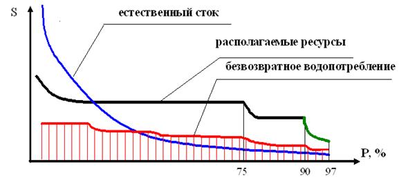 58. Водохозяйственный баланс речного бассейна рекомендуется составлять, начиная с первого от истока реки водохозяйственного участка или от Государственной границы Российской Федерации (для трансграничных водных объектов). Далее водно-балансовые расчеты выполняются для других водохозяйственных участков по течению главной реки речного бассейна (от истока к устью), включая водохозяйственные участки подбассейнов реки. 59. На каждом водохозяйственном участке определяется объем и режим безвозвратного водопотребления, который в сумме с комплексным попуском (транзитным стоком) сопоставляется объему и режиму располагаемых водных ресурсов в замыкающем створе – то есть рассчитывается водохозяйственный баланс участка. В результате баланса определяется проектный приток к нижележащему водохозяйственному участку. В случае несведенного баланса (дефицит водных ресурсов), проектный приток к нижерасположенному водохозяйственному участку определяется после распределения дефицита между потребителями и комплексным попуском. 60. Ресурсы нижерасположенного водохозяйственного участка определяются суммированием проектного притока сверху со стоком, формирующимся на данном водохозяйственном участке. При необходимости (значительные расстояния, существенное влияние руслового и пойменного регулирования) водные ресурсы участка рассчитываются с учетом русловой трансформации стока и фактора времени по специальной методике (см. п.33). В большинстве случаев сток, формирующийся на участке (боковая приточность), определяется как разность объемов естественного стока в замыкающем и входном створах в принятых интервалах времени. 61. По результатам водохозяйственных балансов для каждого створа устанавливаются дефицитные водохозяйственные участки, а также резерв водных ресурсов начиная с современного уровня водопотребления до проектной перспективы, обычно с интервалом в пять лет. Дефицитными считаются водохозяйственные участки, на которых требования водопользователей не удовлетворяются в соответствии с критериями, указанными в разделе III.5 настоящей методики. 62. Расчетный фон создается балансами характерных по водности лет для всех рассматриваемых уровней развития при современном составе инженерно-технических и природоохранных мероприятий. Это необходимо для последующего технико-экономического обоснования рекомендуемых водохозяйственных и водоохранных мероприятий. 63. В общем случае водообеспеченность разных водохозяйственных участков характеризуются различными календарными годами расчетного гидрологического ряда. Это связано с возможной асинхронностью стока по длине реки. Поэтому для большинства водных объектов характеристикой водообеспеченности является оценка по всему расчетному многолетнему ряду в виде совмещенных кривых обеспеченности естественного стока, располагаемых водных ресурсов и объемов водопотребления (рисунок 2). Такой подход позволяет анализировать ситуацию в остромаловодных (P