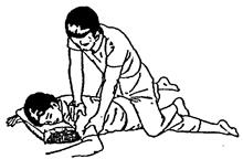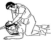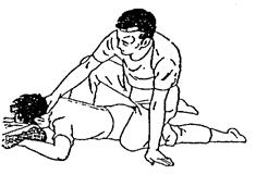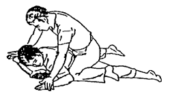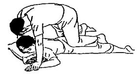 Выполните второй этап. Ладонями захватите латеральную поверхность рук на уровне нижней трети плеч. Массажно-давящее воздействие выполните на трех уровнях плеча путем их сдавления и легкого вращения при первом проходе в наружную сторону, а при втором - во внутреннюю сторону на всех уровнях, начиная с дистального. Критерием эффективности приема является релаксация мышц в области воздействия. Прием № 42 Воздействие коленями на область спины и поясницы. Прием двустороннего действия. Прием направлен на релаксацию трапециевидной, широчайшей и крестцовоостистой мышц спины, а также на коррекцию реберно-позвонковых и реберно-отростчатых суставов на уровне грудного отдела позвоночника. Исходное положение пациента - лежа на животе. Руки согнуты в локтевых суставах на уровне головы. Ноги разведены, стопы ротированы внутрь. Голову поверните влево. Исходное положение врача. Займите исходное положение "верхом" с упором ладонями на тыльную поверхность кистей рук пациента, а коленями на поясницу.