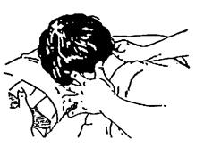 Прием № 39 Воздействие на область шеи сзади справа в проекции грудино-ключично-сосцевидной мышцы. Прием направлен на релаксацию грудиноключичнососцевидной мышцы. Исходное положение пациента - лежа на животе. Руки согнуты в локтевых суставах на уровне головы. Ноги разведены, стопы ротированы внутрь. Голова лежит с упором на лоб. Исходное положение врача. Займите исходное положение "верхом" с упором на правое колено и правую ладонь.