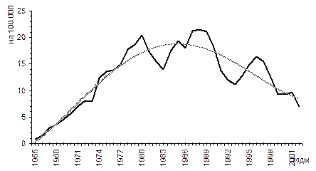 Рис. 2 Заболеваемость вирусным гепатитом В в Республике Беларусь в 1965 – 2002 гг