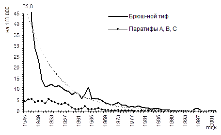 Заболеваемость брюшным тифом и паратифами в Республике Беларусь в 1945 – 2002 гг.