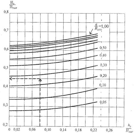 1. Определяется глубина потока в створе «0» при прохождении волны прорыва (Н0). По графику (рисунок 3), исходя из полученных соотношений: бытовой глубины в створе «0» и глубины у плотины в момент разрушения