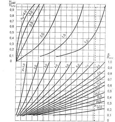 Пример: НУМР/ННПУ= 0,94; nw = 1,2; b/ВНПУ= 0,25; А =? 1. На графике, из значения НУМР/ННПУ = 0,94 проводится горизонтальная линия. 2. На этой линии, интерполяцией, определяется местоположение значения отношения nw = 1,2 (отмечается точкой). 3. Из полученной точки вниз проводится вертикаль. 4. Из значения отношения b/ВНПУ = 0,25 (от оси) проводится горизонтальная линия до пересечения с вертикалью. Искомое значение А= 25.