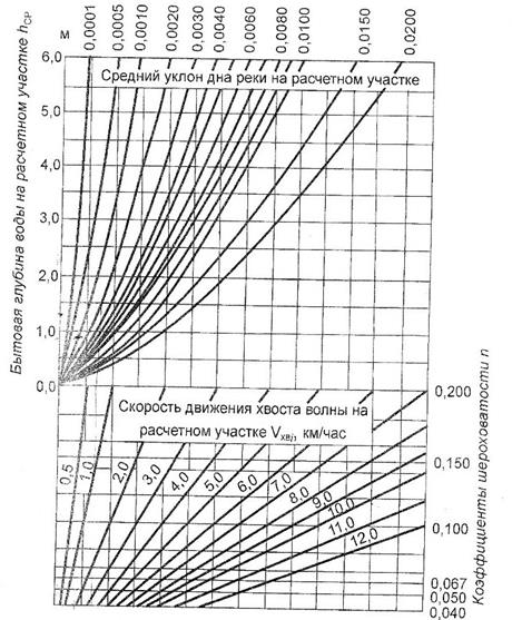 Тфр1 = Tфр0 + tфрI, ч (14) 9. Скорость продвижения хвоста волны по участку определяется по графику (рисунок 8) в зависимости от бытовой глубины на этом участке (hcpI), уклона участка (JI) и коэффициента шероховатости (nI).