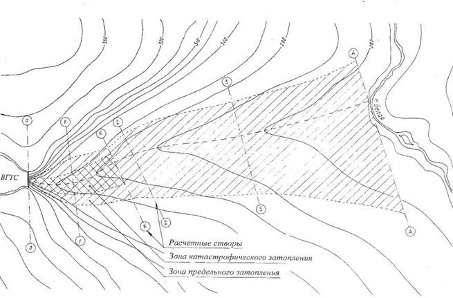 - На плане местности (рис.10) наносится створ «К». В каждом расчетном створе, по обеим сторонам от тальвега, отмечаются точки, соответствующие отметкам уровней катастрофического и предельного затопления. Затем эти точки соединяются цветными пунктирными линиями. Красным цветом очерчивается контур зоны катастрофического затопления, который ограничивается створом «К», синим цветом - зона предельного затопления. Для наглядности, зоны штрихуются линиями соответствующего цвета.