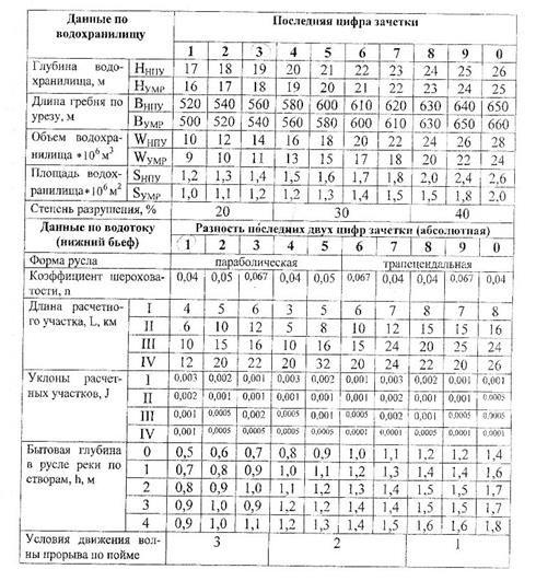 Варианты исходных данных по расчету параметров волны прорыва при аварии на ГОО.