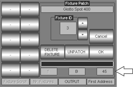 Поле "Fixture patch" появится вскоре после выбора типа прибора. Оно позволяет завершить процедуру прописывания путей, используя колеса регулятора, связанные со соответствующими параметрами, о которых говорилось ранее: § Второе колесо регулятора: используется для установки количества приборов § Третье колесо регулятора: используется для выбора DMX-области А или В для исходящего сигнала § Четвертое колесо регулятора: используется для установки стартового DMX адреса Приведенный выше рисунок изображает 10 Giotto Spott 400, прописанного на DMX выход А, со стартовым DMX адресом 001. Пути остальных девяти устройств будут автоматически прописаны консолью Pilot 3000 с учетом количества DMX каналов, используемых каждым прибором. Нажатие клавиши "ОК" сохранит и подтвердит только что сделанное прописывание путей к прибору. Прежде чем продолжать, дождитесь, пока индикатор выполнения, расположенный под клавишей "ОК", сообщит о выполнении процедуры сохранения. По завершении поле "Address patch", содержащее название устройства, пути к которому были прописаны, а также соответствующая информация о DMX каналах и выходах, появится вновь, как показано на рисунке ниже. Нажатие клавиши "Cancel" отменяет процедуру прописывания путей.