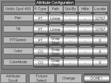 Свойства атрибутов, доступных для каждого типа прописанных приборов, таковы: § Palette Type: определяет, с какими категориями палитры атрибут может быть связан. § Path: определяет, как будет действовать атрибут во время затухания. § Stand By: определяет, какое значение от 0 до 255 будет иметь атрибут, когда будет отключен во время редактирования или воспроизведения. § Hi-Lite: определяет, какое значение от 0 до 255 будет присвоено каждому атрибуту в случае, если устройство будет активировано командой "Hi-Lite". § Locate: определяет, какое значение от 0 до 255 будет присвоено каждому атрибуту в случае, если устройство будет активировано командой "Locate". Для изменения свойств Атрибутов, находясь в панели "Fixture Configuration", выполните следующее: § Нажмите экранную клавишу, относящуюся к свойству атрибута, которое необходимо изменить. § При помощи третьего колеса регулятора, расположенного под надписью "Change", переключайтесь между доступными вариантами и выберите необходимый параметр. § По завершению нажмите DONE! § Дождитесь окончания процедуры обновления, отображаемой индикатором выполнения. Колеса регулятора, называемые "Attribute Scroll" и "Fixture Select" соответственно используются для: § Прокрутки атрибутов для выбранного прибора § Выбора другого прибора, если они прописаны. Сейчас мы опишем опции и способы действия функции Attribute. На первый взгляд, все эти установки сложны для понимания для тех, кто с ними ранее не встречался, поэтому мы рекомендуем провести во время чтения ряд проверок с целью получить полные знания об использовании установок и о том, как они могут быть полезны для оператора. Тип палитры Palette Type В осветительной индустрии используются сотни программируемых приборов, отличающихся друг от друга конфигурацией атрибутов. Консоль Pilot 3000 была разработана для упрощения управления различными приборами при помощи системы, основанной на группировке схожих атрибутов в шесть групп, называемых палитрами (Pallette). Это означает, что Атрибут, обычный для всех имеющихся в библиотеке устройств приборов, вносится в одну из палитр. Имеются следующие палитры: