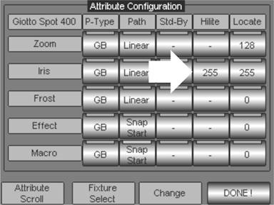 Для того, чтобы изменить связь между атрибутом и его адресом: § Прокрутите атрибуты при помощи колеса регулятора "Attribute Scroll" до появления атрибута, который необходимо изменить (в данном примере – Macro). § Нажмите экранную клавишу типа адреса Path type (на рисунке она обозначена стрелкой), расположенную в колонке "Path ". § Прокрутите 3 доступных варианта, используя колесо регулятора "Change", до появления необходимого варианта (например, Snap End). Доступные варианты будут отображены на клавише. § Нажмите DONE! для подтверждения. § Дождитесь окончания процедуры обновления, отображаемой индикатором выполнения. Приведенная ниже таблица показывает, как атрибуты связаны с адресами по умолчанию в библиотеке устройств консоли Pilot 3000.