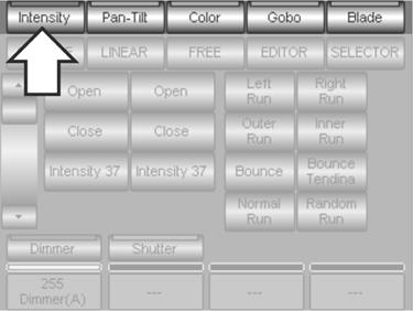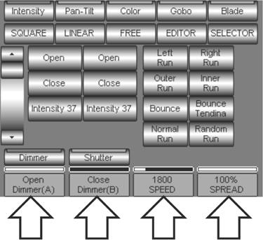 Клавиши атрибутов и параметров Клавиши атрибутов позволяют выбирать атрибут, к которому будет применен эффект в семействе палитр. После применения желаемого атрибута, четыре красных поля отобразят параметры эффекта. Расположенные ниже регуляторы изменяют параметры эффекта, если это необходимо. На примере ниже мы приводим пример выбора атрибутов диммера без применения какого-либо эффекта.