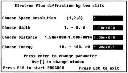 Программа “Diffraction” позволяет наблюдать результаты дифракцион-ного опыта при прохождении потока электронов с энергией Предполагается, что распределение амплитуды вероятности обнаружить электрон на каждой из щелей определяется выражением
