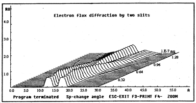1. Установить в меню лабораторной задачи (рис. 3.3) пространственное разрешение, равное 1, ширину щели – 1.5 Å, расстояние между щелями – 5 Å и энергию электронов – 10 эВ. Наблюдайте дифракционную картину на экране терминала. Клавишей F4 можно увеличить масштаб изображения. Наблюдайте также пространственно - временную картину движения элект-ронных волн (рис. 3.4 и 3.5). Отпечатайте полученные графики. 2. Рассчитайте длину волны де Бройля электронов с энергией 10 эВ. По формуле (3.19) рассчитайте расстояние от центра дифракционной картины до первого минимума. Расстояние от щелей до экрана z присутствует на