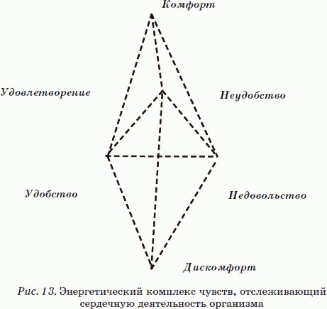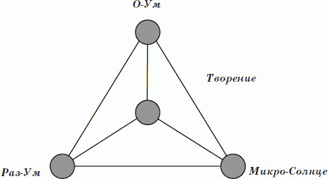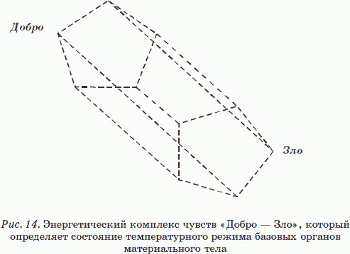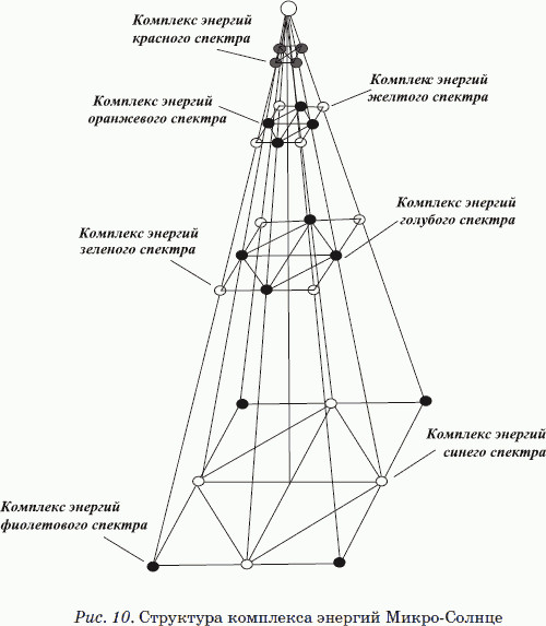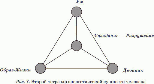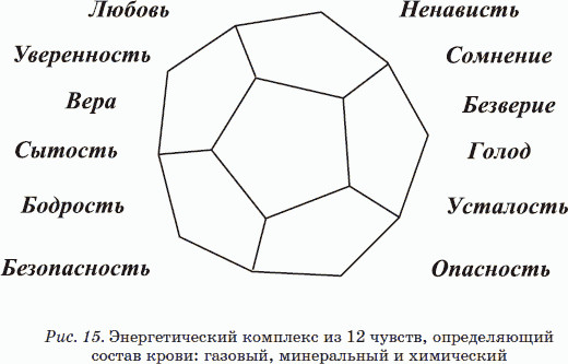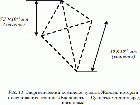 При возникновении болезни в организме изменяются частота вибрации и интенсивность энергий. Практика вибрационной терапии показала, что каждый их семи спектров Микро-Солнца может иметь как четные, так и нечетные разряды вибраций. Например, во время сеансов мною наблюдались частоты от 229 до 224 виб./сек. в фиолетовом спектре и частоты от 226 до 28 виб./сек. в зеленом спектре. На частоты Микро-Солнце реагируют молекулы воды в жидких средах организма. В колонке «Интенсивность излучения» таблицы 1 проставлены значения энергий в здоровом организме. Энергии Микро-Солнце имеют хороший запас по интенсивности и при необходимости могут увеличить ее от 8 до 100%, то есть более чем в 10 раз. Энергии повышенной интенсивности позволяют «мягко» разрушать больные клетки и ускорять процесс деления здоровых, восстанавливая таким образом больной организм. Общий диапазон вибраций Микро-Солнце от 21 до 234 виб./сек. Размер стороны квадрата в основании внешней пирамиды Микро-Солнце равен примерно 0,16*10–5 мм, высота пирамиды – 0,36*10–5 мм. Комплекс энергий Образ-Жизни Человеку даны пять чувств: зрение, слух, вкус, обоняние и осязание. С их помощью он видит, слышит, различает запахи и вкус, чувствует тепло и холод, влажность и сухость, боль. Так в его сознании формируются образ окружающего мира и отношение к природным явлениям, растениям, животному миру, к людям. Так человек обретает свое понимание жизни, свой образ жизни. В человеческом теле нет органа памяти. Память человека обо всех своих ощущениях, своем восприятии окружающего мира находится в структуре энергетической сущности. Память – это энергетическая субстанция. С помощью пяти органов чувств сущность человека формирует комплекс, который я назвал Образ-Жизни. Это структурированный комплекс парных элементарных энергий чувств, каждое из которых имеет свою частоту вибрации. Ими являются Любовь и Ненависть, Радость и Печаль, Комфорт и Дискомфорт и т. д. Мне удалось сформулировать структуру комплекса энергий Образ-Жизни и определить его основные свойства. Осознанный человеком образ окружающего мира фиксируется на энергетическом уровне в виде набора энергий чувств. Состояние всего этого комплекса воспринимается на уровне вибраций другими комплексами энергетической сущности. В зависимости от того, насколько сбалансированы между собой все энергии чувств, сущность определяет ту «дозу» тайных на сегодня знаний, которые можно доверить человеку. Основной принцип доверия – «не навреди». Получаемые от Раз-Ум знания не должны причинить вреда окружающей природе и людям. Очевидно, это основная причина, по которой «посвященные» (учителя, гуру и т. п.) не раскрывают их всем желающим, не каждого берут в ученики. Комплекс Образ-Жизни состоит из 38 элементарных энергий чувств, объединенных в пять трехмерных геометрических фигур (пять кристаллов): тетраэдр, куб, пятигранная призма, двойная треугольная пирамида, додекаэдр. Тетраэдр (рис. 11) содержит четыре элементарные энергии чувств, связанные с понятием «жажда». Эти энергии формируют уровень активности молекул воды в жидких средах материального тела: крови, желчи, лимфе, межклеточной жидкости. Молекулы воды принимают активное участие в химических процессах, происходящих в клетке. Комплекс воспринимает изменения состояния чувства Жажда в жидких средах, используя следу