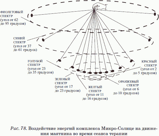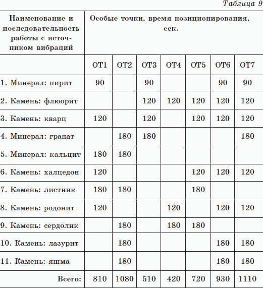 Ежедневно (обязательно утром) надо взять маятник в руку и задать вопрос своей энергетической сущности: «Полезно ли мне сегодня работать с биологически активными точками?» При ответе «Нет» сеанс терапии в этот день не проводится. При ответе «Да» продумывается серия вопросов, с помощью которых определяется программа сеанса терапии. Как уже упоминалось выше, она включает: • выяснение времени проведения терапии: утром, после обеда, вечером; • определение биологически активных точек; • нахождение источников вибраций; • уточнение последовательности использования источников вибрации; • уточнение последовательности использования биологически активных точек; • определение длительности воздействия источника вибраций на каждую биологически активную точку. 1. Выяснение времени проведения сеанса терапии. Для определения времени работы задаются два вопроса. • «Сеанс терапии надо провести до 12 часов?» • «Сеанс терапии надо провести после 12 часов?» Практика показывает, что сеансы терапии, связанные с системой пищеварения, обычно проводят до 12 часов. Работу, имеющую отношение к сердечной деятельности, осуществляют после 12 часов. Некоторые сеансы, связанные с опорно-двигательной системой, назначают после 20—23 часов. Время проведения сеанса влияет на результат, на эффективность оздоровления организма. Поэтому его лучше уточнить с помощью дополнительных вопросов. Например: «Сеанс терапии лучше провести после 14 часов (после 16, 18 часов и т. д.)?» 2. Определение биологически активных точек для сеанса терапии. Вначале задается вопрос о работе с особыми точками: «Надо ли работать с особыми точками?» Если ответ положительный, задайте следующие семь вопросов: • «Работать с точкой ОТ1?» (например, «Нет»); • «Работать с точкой ОТ2?» (например, «Нет»); • «Работать с точкой ОТ3?» (например, «Да»); • «Работать с точкой ОТ4?» (например, «Нет»); • «Работать с точкой ОТ5?» (например, «Нет»); • «Работать с точкой ОТ6?» (например, «Да»); • «Работать с точкой ОТ7?» (например, «Да»). Согласно ответу «Да» формируется перечень особых точек, с которыми надо будет поработать. Для приведенного примера это точки ОТ3, ОТ6 и ОТ7. Если ответ на вопрос: «Надо ли работать с особыми точками?» – отрицательный, то для определения биологически активных точек используйте вышеописанные методики М5, М6 или М7. 3. Нахождение источников вибраций. Для оздоровления организма можно использовать несколько источников вибраций. Это камни, минералы и кристаллы (далее – камни), пальцы рук и ладони, цветы, модели комплексов энергий. Вначале задайте серию вопросов по выбору этих источников: • «Работать с камнями?» (например, «Да»); • «Работать с пальцами рук?» (например, «Нет»); • «Работать с ладонями рук?» (например, «Да»); • «Работать с цветами?» (например, «Нет»); • «Работать с моделями?» (например, «Да»). Согласно полученным ответам определите группы источников вибраций, с которыми надо будет поработать. Для нашего примера это камни, ладони рук и модели комплексов энергий. 3.1 Коллекция камней, минералов и кристаллов. Коллекция камней может состоять из 100 и более экземпляров. В моем собрании более двух сотен камней. Конечно, ежедневно обращаться к каждому из них для выяснения пригодности к той или иной процедуре сложно. Лучше разделить коллекцию на условные группы и подгруппы (по 10—15 экземпляров). Вкл