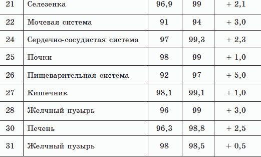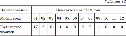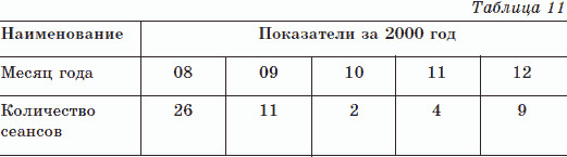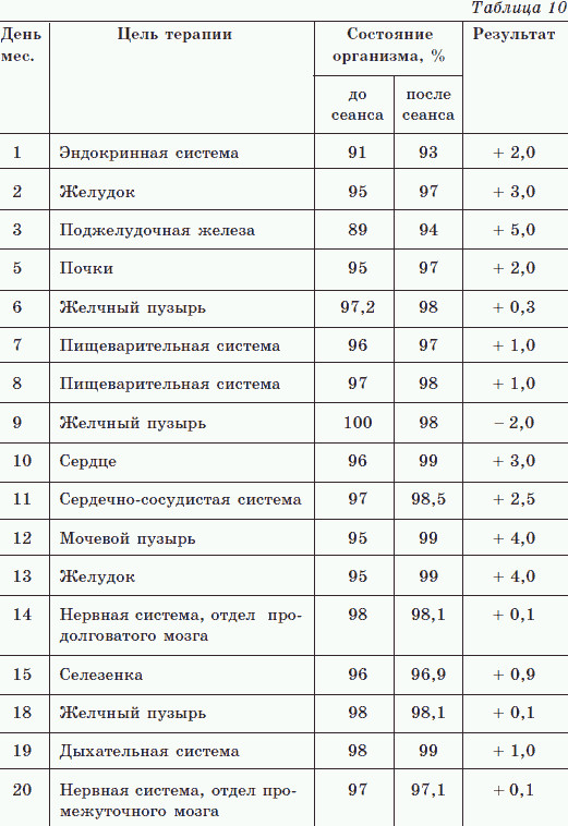 Данные таблицы 10 показывают, что энергетическая сущность действительно хорошо знала состояние моего организма. Оздоровление началось с воздействия на эндокринную физиологическую систему. Затем я улучшил состояние основных органов: желудка, поджелудочной железы, печени и желчного пузыря (2, 3, 5, 6 августа). Следующие два дня – 7 и 8 августа – были посвящены воздействию на пищеварительную систему. На следующий день энергетическая сущность приняла неординарное решение – затормозила деятельность желчного пузыря, его активность снизилась со 100% до 98%. Можно предположить, что состояние основных органов к 9 августа было таковым, что избыток желчи оказался вреден для организма. В течение месяца моя сущность воздействовала на восемь базовых органов: желудок, кишечник, мочевой пузырь, поджелудочную железу, печень, почки, селезенку и сердце. Чаще других (пять раз) воздействию подвергался желчный пузырь. Кроме того, было задействовано шесть физиологических систем: • нервная; • эндокринная; • сердечно-сосудистая; • дыхательная; • пищеварительная; • мочевая. Количество сеансов терапии в последующие месяцы варьировалось. В таблицах 11, 12 и 13 рассмотрена интенсивность терапии организма с августа 2000 по июль 2002 года. За этот период было проведено 105 сеансов по особым точкам ОТ1, ТО2, ОТ3, ОТ4, ОТ5, ОТ6 и ОТ7. Другие биологически активные точки в указанное время задействованы не были.