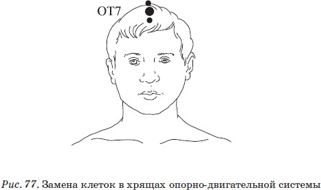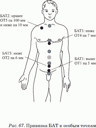 Первый этап, с 13 по 29 августа, который можно назвать предварительным разогревом организма, был связан с увеличением активности ряда физиологических систем и органов. Так, активность отдела среднего мозга нервной системы увеличилась на 3%, эндокринной системы – на 5%, почек – на 10%, мочевого пузыря – на 15%. В связи с этим потребовалось восстановить работу входного (верхнего сфинктера) и выходного (нижнего сфинктера) отверстий мочевого пузыря (100%). Увеличение активности физиологических систем осуществлялось воздействием на особые точки организма (ОТ1, ОТ2, ОТ3, ОТ4, ОТ5, ОТ6 и ОТ7) большим количеством источников вибраций. Так, для увеличения активности нервной и эндокринной систем я использовал шестьдесят камней. Изменение активности органов тела осуществлялось с использованием как особых точек, так и обычных БАТ (рис. 67). Месторасположение обычных биологически активных точек БАТ1, БАТ2, БАТ3, БАТ4 и БАТ5 определялось по методике М5 (см. раздел «Определение биологически активной точки на теле) с помощью привязки к особым точкам. Впервые в сеансах терапии я стал использовать обычные биологически активные точки при восстановлении предстательной железы. Так, воздействуя на точку БАТ1 четырьмя видами частот вибраций и меняя время (длительность позиционирования) воздействия, я увеличил активность поджелудочной железы на 2%, 3% и 4%. 20 августа был восстановлен верхний сфинктер (верхнее отверстие мочевого пузыря) путем воздействия на обычные биологически активные точки БАТ1, БАТ2 и БАТ5 (рис. 67). 23 августа я уменьшил активность мочевой системы, воздействуя на обычные биологически активные точки БАТ3 и БАТ4 (рис. 67). Второй этап восстановления предстательной железы связан с непосредственным воздействием на нее во время сеанса терапии. Первое такое воздействие было осуществлено 2 сентября 2002 года пятью камнями (пятью частотами вибрациями) с использованием особой точки ОТ3. Этот «пробный» сеанс позволил восстановить предстательную железу всего на 0,4%. Затем нужно было привести в порядок проводящие каналы продолговатого мозга (1%) и дополнительно увеличить активность желчного пузыря на 3%. Интенсивное воздействие на предстательную железу осуществлялось в течение восьми сеансов: 8 и 30 сентября, 4, 10, 24, 25, 26 октября и 4 ноября. Оно проводилось через особые точки с использованием большого количества частот вибраций (см. таблицу 14). Сеансы не были ежедневными, и в этом присутствовал определенный смысл – организм постепенно привыкал к новой ситуации. Практически все современные методики лечения болезней практикуют интенсивное воздействие на организм, не дают ему отдохнуть. Например, те же таблетки «кардура» нужно было принимать два раза в день в течение трех месяцев. Восстановление предстательной железы происходило неравномерно. Вначале очень медленно (0,4%, 1,0%, 0,3%), затем темпы увеличились (15,0%, 25,0%), а потом снизились (15%, 2,0%): • 2 сентября – 0,4%; • 8 сентября – 1,0%; • 30 сентября – 3,0%; • 4 октября – 6,0%; • 10 октября – 15,0%; • 11 октября – 25,0%; • 24 октября – 15,0%; • 25 октября – 15,0%; • 26 октября – 15,0%; • 4 ноября – 2,0%. За период с 13 августа по 4 ноября предстательная железа была восстановлена на 97,4%. Остальные 2,6% организм восстановил сам, без внешнего воздействия на биологически активные точки. Обратите внимание на то, что в сеансах терапии с применением источников вибраций от