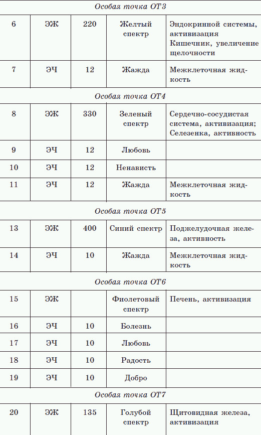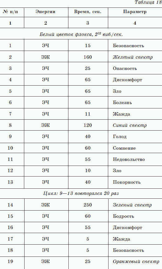 В первом столбце таблиц отображается последовательность воздействия энергий на организм. Во втором показан вид применяемой энергии. В третьем указано время действия энергии на организм. В четвертом приводятся названия спектров излучения Микро-Солнца (фиолетовый, синий, голубой, зеленый, желтый, оранжевый, красный) или энергии чувств Образа-Жизни. Белый цветок флоксов активировал воздействие трех спектров энергии Микро-Солнце в следующей последовательности: желтый, синий, оранжевый. Энергии Микро-Солнце повлияли на активность: • кишечника – желтый спектр; • продолговатого мозга – синий спектр; • желчного пузыря – оранжевый спектр. Изменение активности этих органов повлияло на одиннадцать энергий чувств: Болезнь, Жажда, Голод, Сомнение, Недовольство, Зло, Смирение, Бодрость, Дискомфорт, Опасность, Безопасность. Действия, отмеченные пунктами 9—13, повторялись циклически 20 раз. Розовый цветок флоксов также стимулировал активность трех спектров энергии Микро-Солнце в следующей последовательности: голубой, синий, оранжевый. Эти энергии воздействовали на активность: • эндокринной системы – голубой спектр; • среднего мозга – синий спектр; • селезенки – оранжевый спектр. Изменение активности указанных органов повлияло на семь энергий чувств: Сомнение, Зло, Печаль, Здоровье, Жажда, Опасность, Безопасность. Действия, отмеченные в пунктах 14—15, повторялись циклически 5 раз. В результате воздействия белого и розового цветков флоксов на особую точку ОТ6 осуществлена стабилизация сердечно-сосудистой системы до уровня 99,6%. Пример 2. Сеанс терапии от 27 сентября 2007 года. Его цель – нормализация проводящих путей продолговатого мозга нервной системы. Источник вибраций – модель комплекса энергий тетраэдр, которую необходимо было держать в правой руке (это важно!). Частота вибрации модели 230 виб./сек. Воздействие источником вибрации осуществлялось на все особые точки тела ОТ1 – ОТ7. Последовательность работы с особыми точками тела приведена в таблице 20.