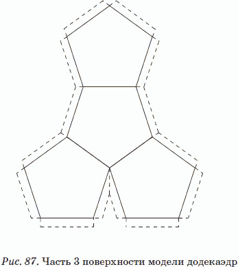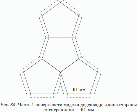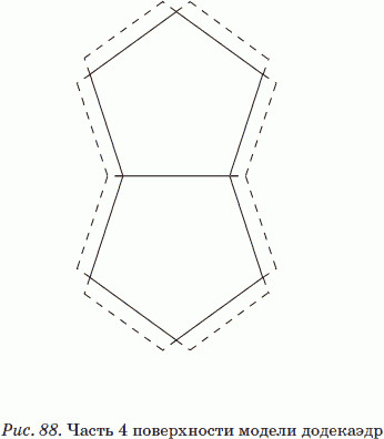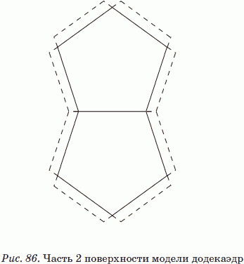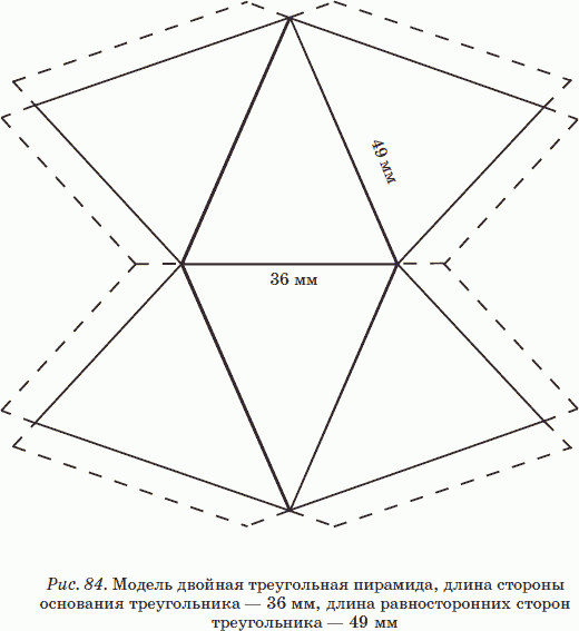Данные, приведенные в таблице 19, наглядно демонстрируют связь изменения состояния физиологических систем и органов тела и энергий чувств. Например, рассмотрим шаг № 15: в результате воздействия фиолетового спектра Микро-Солнце на организм изменились энергии четырех чувств: Болезнь, Любовь, Радость и Добро. Иными словами у меня поменялось восприятие образа жизни в отношении болезни, любви, радости и добра. Во время сеанса терапии я держал модель тетраэдра в правой руке. Эта рука излучает четную частоту вибрации 228 виб./сек. У тетраэдра использовалась одна четная частота вибрации 230 виб./сек. Левая рука излучает нечетную частоту вибрации 229 виб./сек. Таким образом, используемая рука имеет большое значение. Во время сеанса терапии применялись две четные частоты вибрации (230 и 228 виб./сек.) – модели и ладони правой руки. В результате воздействия моделью тетраэдра на семь особых точек организма нормализовалась деятельность проводящих каналов нервной системы от продолговатого мозга до следующих органов: вилочковой, поджелудочной и щитовидной желез, желудка, кишечника, печени и селезенки. Глава 4 Модели энергий чувств составляют комплекс Образ-Жизни энергетической сущности и включают следующие геометрические фигуры: • тетраэдр, реальный размер радиуса описанной вокруг тетраэдра сферы равен примерно 1,34*10–3 мм; • куб, реальный размер радиуса описанной вокруг куба сферы равен примерно 1,66*10–3 мм; • пятигранную призму, реальный размер радиуса описанной вокруг призмы сферы равен примерно 1,93*10–3 мм; • двойную треугольную пирамиду, реальный размер радиуса описанной вокруг пирамиды сферы равен примерно 1,77*10–3 мм; • додекаэдр, реальный размер радиуса описанной вокруг додекаэдра сферы равен примерно 1,90*10–3 мм. Масштаб моделей геометрических фигур энергий чувств выбран из условия обеспечения требуемой точности изготовления (склеивания частей модели). Чем больше масштаб, тем меньше ошибка при склеивании частей будет искажать геометрическую форму модели. Например, если масштаб модели 1: 100 (в 100 раз больше), то ошибка при склеивании модели в 1 мм исказит геометрическую фигуру на 1%. Методом радиэстезии я определил, что допустимое искажение формы объекта не должно превышать 1,0*10–5%. Масштаб каждой фигуры определялся, исходя из реального размера комплекса энергий и обеспечения требуемой точности изготовления. Модель тетраэдр Модель тетраэдр приведена на рисунке 81. Она состоит из четырех треугольников (сплошные линии на рисунке). Пунктирными линиями выделена та часть бумаги, которая используется для склеивания между собой сторон треугольников. Внутренний треугольник уже соединен с каждым из трех остальных. По линиям его сторон сгибаются стороны трех других треугольников и склеиваются с использованием площади бумаги, отмеченной пунктиром. Главное условие – обеспечение герметичности фигуры. Это означает, что по линиям склеивания треугольников не должно остаться «дырок», модель должна быть герметична. В противном случае из нее «уйдет» энергия, она перестанет быть источником вибраций. В сеансах терапии используются точки тетраэдра, расположенные в центре каждого треугольника. Каждая его сторона имеет строго определенную частоту вибрации, ее значение можно написать здесь же карандашом. Сама частота определяется с помощью маятника. Моде