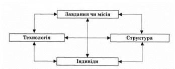 Рис. 3.2. "Діамант" Г. Лівітта За аналогічним принципом побудована і відома модель "7-S" компанії МакКінсі (Т. Пітере, Р. Уотермен), яка передбачає виокремлення таких змінних внутрішнього середовища, як спільні цінності, стратегія, структура, системи, стиль, співробітники, здібності. Недолік цієї моделі внутрішнього середовища організації — відсутність такої важливої складової, як цілі та місія організації, а перевага — чимала увага до так званих "м'яких" змінних управління, або суб'єктивних параметрів внутрішнього середовища (спільні цінності, стиль, здібності). Т, Пітере і Р. Уотермен, як і Г. Лівітт, підкреслювали взаємозалежність змінних, що природно, оскільки всі вони є елементами однієї системи. Цікавий підхід до формування внутрішнього середовища організації розробили Д. Бодді і Р. Пейтон. Вони створили інтегральну модель організації, яка включає такі елементи: цілі, бізнес-процеси, технології, люди, влада, структура, культура організації. Д. Бодді і Р. Пейтона складається з наступних елементів. Цілі. У центрі моделі (символічно) — цілі, на досягнення яких спрямована діяльність членів організації, що є бажаним станом організації в майбутньому. Бізнес-процеси. Групи видів діяльності і технології, за допомогою яких індивіди "прокладають дорогу" до цілей (процеси розробки товарів, отримання замовлень, виробництва продукту, доставки, оплати). Члени організації в процесі спільної праці перетворюють наявні ресурси та створюють нові цінності, досягаючи бажаних результатів. Технології. Устаткування, використовуване індивідами для перетворення ресурсів на корисний продукт (будівлі, верстати, офіси, комп'ютери, телекомунікації та інформаційні системи). Люди. Маються на увазі насамперед індивіди, які є членами організації та роблять для досягнення її мети внесок у формі навиків, знань та участі в процесі праці. Не слід забувати і про індивідів, що формально не є членами організації, але впливають на її діяльність. Влада. Відносини влади утворюють ядро менеджменту, формування якого здійснюється в міру відособлення управління як особливого виду діяльності та його інституціоналізації в організації. Деякі учені розглядають насамперед роль відносин менеджменту та працівників у досягненні балансу влади в суспільстві, предмет дослідження інших — проблеми розширення владних повноважень індивідів в ієрархії організації. Структура. Це спосіб розділення та координації праці в організації в широкому сенсі. Візуально вона виступає у формі організаційних діаграм. Формальну структуру зазвичай доповнюють неформальні механізми, що роблять не менш істотний вплив на роботу організації. Культура. Порівняно з іншими елементами організації це поняття базується в основному на нематеріальних категоріях. Нині багато менеджерів вважають організаційну культуру одним із найважливіших інструментів виконання поставлених завдань. Члени організації виробляють особливі методи праці, які у свою чергу можуть впливати на способи виконання робочих завдань та спілкування колег, включаючи новачків. Одним з сучасних підходів до виокремлення внутрішніх змінних, що мають інтегративне значення, є підхід, викладений у підручнику "Управління організацією" за редакцією А. Поршнева, 3. Румянцевої та Н. Саломатіна. Сутність цього підходу становить думка, що внутр