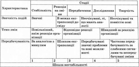 Рис. 3.5. Шкала для оцінки рівня нестабільності зовнішнього середовища При встановленні рівня нестабільності спочатку визначають, які з умов діяльності будуть найменше стабільними найближчими роками (5—7 років). На думку більшості дослідників, такими чинниками для українських організацій є політичні й економічні умови. Згідно з параметрами І. Ансоффа, ці умови можна оцінити на рівні 3,5—4 балів, тобто як несподівані, абсолютно нові, такі, що відбуваються швидше, ніж організації встигають адаптуватися, часто абсолютно непередбачувані, але, напевно, все ж таки при використанні елементів стратегічного управління їх можна оцінити як частково передбачувані за слабкими сигналами. І. Ансофф виділяє такі види стратегічного управління, що використовуються залежно від ступеня нестабільності зовнішнього середовища: • управління на основі екстраполяції тенденцій (довгострокове планування), що застосовується в умовах порівняно невисокого ступеня нестабільності (оцінка нестабільності — 2,5—3,0); • управління на основі передбачення змін (стратегічне планування, вибір стратегічних позицій), що застосовується за середніх значень ступеня нестабільності (оцінка — 3,0—3,5); • управління на основі гнучких експертних рішень (ранжування стратегічних завдань; управління за слабкими сигналами; управління в умовах стратегічних несподіванок), що застосовується для умов істотної нестабільності зовнішнього середовища (оцінка вище 3,5). Таким чином, для середніх і великих соціально-економічних систем, що працюють в Україні в умовах ринку, можливий вибір виду стратегічного управління на основі слабких сигналів та гнучких експертних рішень. Саме цей спосіб управління організацією дає змогу своєчасно запобігти негативним наслідкам до того, як вони стали необоротними, і спрямувати організацію на прийнятий і раціональний шлях розвитку. Поширені й інші методи аналізу та оцінки зовнішнього середовища. Для наших умов одним із найприйнятніших є метод "5 х 5м для визначення найбільш значимих елементів зовнішнього середовища, який запропонував М.Х. Мескон у 1984 році. Аналіз зовнішнього середовища передбачає інтерпретацію статистичних показників та даних різних зовнішніх або внутрішніх досліджень. Зазвичай інформація розглядається на двох рівнях. По-перше, аналізуються дані, що характеризують стан макросередовища (чинники зовнішнього середовища непрямої дії, що знаходяться поза контролем організації, але роблять вагомий вплив на її діяльність). По-друге, досліджується інформація про мікросередовище організації (про операційне зовнішнє середовище прямої дії, споживачів, постачальників і конкурентів). Організації мають можливість певною мірою контролювати чинники мікросередовища. Дуже популярним методом дослідження подій, що відбуваються в макросередовищі, є ПЕСТ-аналіз (політичний/правовий, економічний, соціокультурний та технологічний). Перший його крок — ідентифікація основних зовнішніх чинників, що впливають на діяльність організації. Приклади деяких з них представлені на рис. 3.6. Чинники макросередовища по-різному впливають (залежно від розміру, форми і стадії зростання організації) на стратегію бізнесу. Причини і наслідки цих змін необхідно розглядати у зв'язку з їх впливом на конкурентне позиціонування. Мета ПЕСТ-аналізу полягає не про