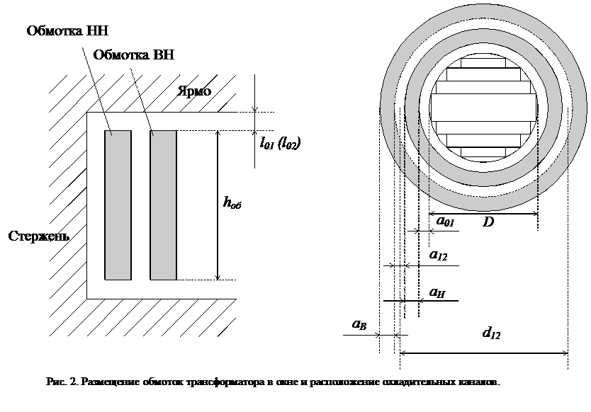 где а01 – толщина охладительного канала между стержнем и обмоткой низкого напряжения; а12 - толщина охладительного канала между обмотками низкого и высокого напряжения. Размеры каналов определяются по таблицам 4.15. и 4.16. [1]. Расстояние между обмотками на стержнях должно быть равно значению, приведенному в таблице 4.15[1]. Если указанное условие не выполняется, необходимо изменить ширину окна до требуемого размера и производить дальнейшие расчеты, используя новое значение.