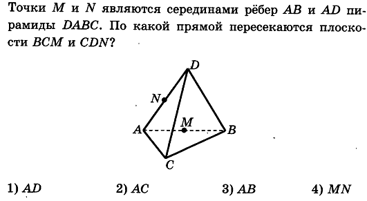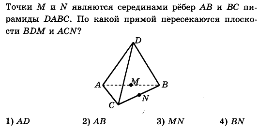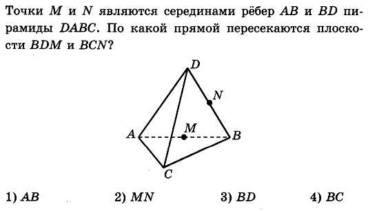 Задание #61 Вопрос: Средняя линия MN трапеции ABCD лежит в плоскости 1) лежит в плоскости 2) пересекает плоскость 3) параллельна плоскости