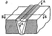 Рис. 8. Конструктивные элементы и дефекты сварного шва, подлежащие измерительному контролю (начало): а, б— размеры (ширина, высота) стыкового одностороннего шва с наружной и внутренней стороны; в — то же двухстороннего сварного шва; г — подрез и неполное заполнение разделки кромок д — чешуйчатость (D1) шва и западание между валиками шва (2); е — размеры поверхностных включений (диаметр — dg; длина — /g; ширина — bg включения); ж — размеры катета шва углового (таврового, нахлесточного) соединения
