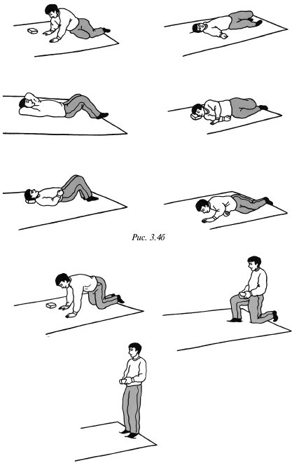 Важно также то, каким образом вы принимаете положение лежа и выходите из него. 1. Найдите подходящее место, где можно лечь. В руках должна быть стопка книг (рис. 3.4а). 2. Неся торс в вертикальном положении, выдвиньте одну ногу вперед и встаньте на колено другой ноги. 3. Положите стопку книг справа или слева от себя примерно в том месте, где потом будет ваша голова. 4. Обопритесь кистями рук о пол и встаньте на четвереньки. 5. Приподнимитесь так, чтобы сохранять равновесие, стоя на руках и на пальцах ног. 6. Опустите ноги на пол так, чтобы колени были направлены в сторону от книг (рис. 3.4б).