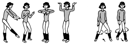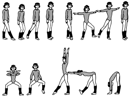 Рис. 5.5 8. И. п. – ноги врозь, стопы развернуты наружу, руки вниз. 1 – шаг (на месте) с пятки правой ногой, с перекатом на всю стопу, левая на носок (перекатом через стопу), таз слегка влево; 2 – то же с другой ноги. 32 раза. 9. И. п. – о. с., ноги врозь. И – подняться на невысокие полупальцы; 1 – правую согнутую ногу поднять вперед – в сторону, одновременно спружинить стопой левой ноги (опуститься на всю стопу), левую согнутую руку вперед, правую в сторону – вниз; и – стойка ноги врозь на невысоких полупальцах; 2 – то же, что 1, но с левой ноги; 3–4 – два раза то же, что 1 с правой ноги; 5–8 – то же, что 1–4, но начинать движение левой ногой. По 8 раз. 10. И. п. – о. с. 1 – небольшой шаг левой вперед; 2 – правую вперед на носок, согнутую левую руку вперед, правую вниз; 3 – небольшой шаг правой назад, руки вниз; 4 – левую назад на носок, слегка согнутую левую руку вперед‑кверху, правую – назад‑книзу. То же с другой ноги. 16 раз. 11. То же, но исполняется с пружинным движением опорной ноги: и – небольшой полуприсед на двух ногах; 1 – выпрямляя правую, левую вперед на носок; и – небольшой полуприсед на правой; 2 – правую приставить к левой; и – небольшой полуприсед на двух; 3 – выпрямляя правую, левую назад на носок и небольшой полуприсед на правой; 4 – приставить левую к правой. По 16 раз с каждой ноги. 12. И. п. – о. с. вполоборота налево к основному направлению. 1 – правую ногу вперед на носок, согнутую левую руку вперед, правую назад и книзу; 2 – правую ногу назад на носок, поменять положение рук; 3–6 – повторить еще 2 раза; 7 – приставить правую ногу к левой; 8 – с поворотом направо, левую ногу назад на носок. То же с другой ноги. По 8 раз (рис. 5.6).