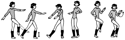 Рис. 5.6 1 3. То же, но исполняется с пружинным движением опорной ноги: и – небольшой полуприсед на двух ногах; 1 – выпрямляя левую, правую вперед на носок; и – небольшой полуприсед на левой, правую слегка согнуть; 2 – выпрямляя левую, правую назад на носок. То же с другой ноги. По 8 раз. 14. И. п. – о. с. 1 – слегка сгибая‑разгибая правую, мах вперед; и – правую назад на полупальцы, левую слегка согнуть – положение глубокого выпада; 2 – переступить на левой ноге – слегка приподнять над полом и вновь поставить на всю стопу; 3–6 – повторить 1–2; 7 – приставить правую ногу к левой; 8 – с поворотом кругом левую назад на полупальцы. То же с левой ноги. По 2 раза. 15. То же, но выполнить с продвижением вперед. 16. И. п. – о. с. 1 – шаг правой ногой в сторону на пятку, небольшой наклон туловища вперед – в сторону к правой ноге, таз слегка отвести назад; 2 – перекатом на всю стопу встать на правую ногу, левую приставить к правой на полупальцы, туловище прямо, таз слегка вперед. (При выполнении движения работа рук напоминает перетягивание каната: 1 – руки вперед, 2 – сгибаются); 3–6 – повторить еще 2 раза 1–2; 7 – шаг правой; 8 – с поворотом налево кругом правую назад на полупальцы. То же с другой ноги. По 8 раз. 17. И. п. – о. с. правым боком к основному направлению, правая рука на поясе, левая внизу. И – небольшой полуприсед на левой, согнутую правую вперед; 1 – опустить правую ногу вперед на носок, не разгибая колено, рука при этом выполняет средний круг, сохраняя согнутое положение; 2–7 – повторить счет 1. И – шаг правой; 8 – с поворотом кругом налево, приставить левую к правой ноге. То же с другой ноги. По 4 раза (рис. 5.7). Соединить упражнения 16 и 17. 4 раза.