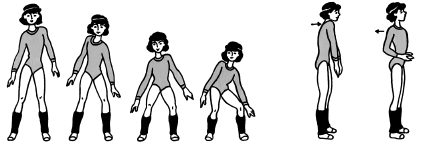 Рис. 5.15 8. И. п. – стойка ноги врозь, руки на голове. Движения грудной клетки вправо‑влево. Голова неподвижна. 16 раз. 9. И. п. – то же, но в полуприседе на двух ногах, руки в стороны. 16 раз. 10. И. п. – полуприсед в стойке ноги врозь, руки на бедрах. Движение грудной клетки вперед‑назад с одновременным све‑ дением и разведением локтей. 16 раз (рис. 5.16).