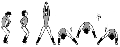 Рис. 5.16 1 1. И. п. – стойка ноги врозь, руки в стороны. Движение таза вправо‑влево, грудная клетка фиксирована. По 8 раз. 12. И. п. – стойка ноги врозь, но руки вперед. Движение таза вперед‑назад. По 8 раз. 13. И. п. – то же. «Рисовать» тазом «восьмерки». 16 раз. 14. И. п. – широкая стойка ноги врозь, руки вверх, одна ладонь на тыльной стороне кисти другой руки. Сгибая правую ногу, наклон вперед, руки опустить между ног; перенося тяжесть тела на обе ноги и сохраняя положение приседа, пружинящий наклон вперед; перенося тяжесть тела на левую ногу, пружинящий наклон вперед, принять и. п. 8 раз. 15. И. п. – упор стоя. Поочередное сгибание и разгибание ног. По 8‑16 раз каждой ногой. 16. И. п. – упор стоя ноги врозь. Подъем на полупальцах правой ноги, таз вправо, то же левой. По 8‑16 раз. 17. То же, но подъем на полупальцах обеих ног одновременно. 18. И. п. – стойка ноги врозь (стопы параллельно) – рис. 5.17.