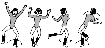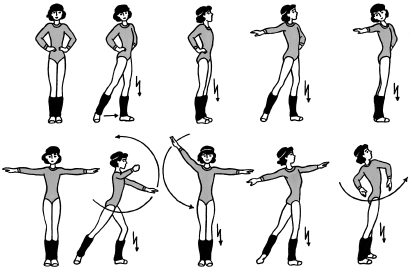 Рис. 5.17. Такт I. 1 – поднимаясь на полупальцах левой ноги, правую вперед, наперекрест перед левой, слегка согнутые руки вправо; и – немного спружинить на левой ноге; 2 – правую ногу в сторону – назад, таз вправо, слегка согнутые руки влево; 3–4 – повторить 1–2, закончить движение, приставляя правую ногу к левой, руки в стороны‑вниз. Такт II. 5–8 – то же, что такт I, но с другой ноги. Такт III. 1 – с поворотом туловища налево, левую ногу назад – полуприсед на правой, руки в стороны; 2 – с поворотом направо (лицом к основному направлению) приставить правую к левой (ноги вместе), небольшой полуприсед на двух ногах, руки на пояс; 3–4 – то же с другой ноги. Такт IV – повторить такт III. 19. И. п. – основная стойка, ноги врозь, стопы параллельно (рис. 5.18). Такт I. 1 – скачок на левой, согнутую правую в сторону, руки в стороны – вверх, ладонями вперед, пальцы в стороны; 2 ‑