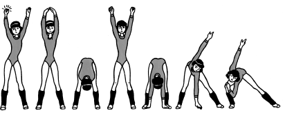 Рис. 5.21 Такт I. 1 – таз вправо, щелчок пальцами правой руки; 2 – таз влево, щелчок пальцами левой руки; и – соединить руки над головой; 3 – наклон вперед, руки опустить между ног; 4 – вернуться в и. п. Такт II – то же, что такт I, но 4 – упор стоя. Такт III. 1 – мах правой рукой назад, поворот туловища направо; 2 – упор стоя; 3–4 – то же другой рукой. Такт IV. 5 – выпад вправо с наклоном вперед, левая рука согнута, ладонью опирается о колено правой ноги, правая рука назад; 6 – пружинящий наклон вперед с рывковым движением правой руки назад; 7–8 – то же в другую сторону. Повторить 4–8 раз.