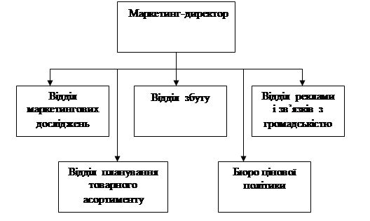 Рис. 2. Функціональна організація служби маркетингу [4] Функціональна організація служби маркетингу свідчить, що відповідальність за виконання кожної функціональної задачі покладається на окрему людину чи групу людей. При цьому не виключається можливість зосередження виконання кількох функцій одним працівником, це залежить від величини і масштабів діяльності готелю. Функціональна організація служби маркетингу є найпоширенішою та найпростішою, проте її ефективність знижується із зростанням кількості та різноманітності послуг і розширенням кількості ринків збуту. Головним у функціональній організації служби маркетингу є її простота та можливість однозначного описання обов'язків кожного працівника. Також важливою задачею являється координація всієї діяльності готельно-ресторанного господарства та орієнтацію її на використання концепції маркетингу.