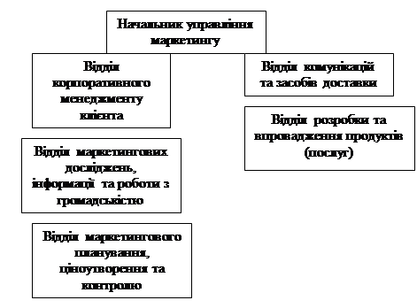 Для організації і координації всього комплексу робіт і функцій в сфері маркетингу в готельному господарстві вимагається створення відповідної структури (служби маркетингу). Служба маркетингу повинна бути з'єднальним ланцюжком між роботами (видами діяльності) і персоналом, між закладом і зовнішнім оточенням. В ідеалі служба маркетингу інтегрує діяльність всіх без виключення підрозділів готелю. Досягнути цього можна різноманітними способами – наприклад, підпорядкувавши службу маркетингу безпосередньо керівнику закладу чи його першому заступникові – директору по маркетингу. В залежності від масштабів діяльності готелю, його особливостей, запропонованих послуг, ринків збуту може бути прийнята люба інша схема, забезпечуючи службі маркетингу можливість інтеграції ринкової діяльності готелю. Люди, які представляють цю службу, повинні володіти маркетинговим мисленням, широким кругозором, бути винахідливими в пошуку нестандартних підходів до вирішення задач, які перед ними стоять. Служба маркетингу складається із трьох структур: функціональної, продуктової, регіональної. Розглянемо кожну із них детальніше.