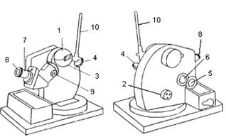 Дослід 2.2. Визначення показника заломлення за допомогою рефрактометра ІРФ-22 Роботу з ІРФ-22 (див. рис.2.2, 2.3) проводять у такому порядку: відкривають верхню півкулю вимірювальної головки. Протирають змоченою ефіром ватою гіпотенузні грані освітленої А та вимірювальної В призми. Дають ефіру випаруватись. Дуже сильно змочувати ефіром півкулі 1 і 3 не потрібно. Маховиком 2 повертають вимірювальну головку так, щоб площина нижньої півкулі 3 та гіпотенузна площина вимірювальної призми набули горизонтального положення. На площину вимірювальної призми наносять піпеткою краплю досліджуваної речовини. Піпетка не повинна торкатися призми, оскільки призма зроблена із спеціального дуже м'якого свинцевого скла.