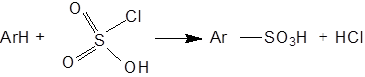 з утворенням сульфокислоти. Як сульфуючі агенти використовуються концентрована сульфатна кислота, моногідрат, олеум. Для кожної реакції сульфування є певна межа концентрації сульфатної кислоти, нижче якої сульфування не відбувається. Сульфокислоти можуть підлягати десульфуванню, причому що легше утворюється сульфокислота, то вона легше десульфується. Тому процес сульфування є зворотним й протікає за рівнянням: ArH + H2SO4 → Ar - SO3H + H2O Реакція сульфування є одним із прикладів електрофільного заміщення. Концентровані розчини сульфатної кислоти й олеуму являють собою складні суміші, в яких поряд з незарядженими частинками H2SO4, H2S2O7, SO3 містяться й різні катіони, наприклад HSO3+, H3SO4+, що утворюються в результаті автопротолізу сульфатної кислоти або інших кислотно-основних перетворень. Сульфуючими агентами можуть бути як нейтральні частинки, так й позитивно заряджені. Наприклад, механізм взаємодії бензолу з сульфатною кислотою можна подати таким чином: