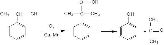 Якщо реакцію окиснення проводити в присутності лугів при 210°С й підвищенні тиску, толуол й етилбензол окиснюються в бензойну кислоту. Для отримання фенолу використовується рідиннофазове окиснення кумолу киснем повітря в присутності мідних або марганцевих каталізаторів. Гідропероксид кумолу, що утворився, розкладають сульфатною кислотою на фенол й ацетон: