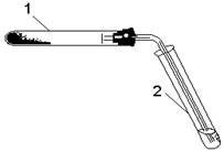 Увага! Дослiд проводять у витяжнiй шафi. У суху пробiрку 1 кладуть трохи ошурок, 5 крапель бензолу i 2 краплi брому. Отвiр пробiрки зразу ж закривають пробкою з газовiдвiдною трубкою, до якої крiпиться скляна трубка-поглинач 2 з натронним вапном (рис. 8.2). Реакцiя починається незабаром, сумiш при цьому майже не розiгрiвається.