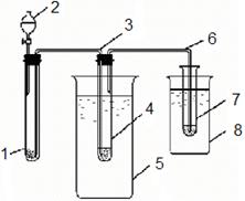 У пробірку 1 (рис.11.1) або маленьку колбочку вміщують декілька маленьких шматочків карбіду кальцію та закривають її пробкою з двома отворами, в один з яких вставлена крапельна лійка 2, а в інший - вигнута газовідвідна трубка 3 з відтягнутим кінцем для підводу ацетилену в “реактор” 4. “Реактор” - пробірку з газовідвідною трубкою 6 - також закривають пробкою, через яку майже до днища проходить трубка 3, яка підводить ацетилен. Леткі продукти реакції виходять з “реактора” по відвідній трубці 6 в маленьку пробірку 7, яку охолоджують водою із снігом. В “реактор” вміщують 0,1 г оксиду ртуті, 2 мл води і 1 мл сульфатної кислоти. Розігріту суміш збовтують, при цьому більша частина ртуті розчиняється з утворенням - сульфату ртуті: HgO + H2SO2 ® Hg SO4 + H2O Після розчинення оксиду ртуті “реактор” із сумішшю закривають пробкою з трубкою, яка підводить ацетилен, та вміщують в водяну баню або склянку 5 із гарячою водою (температура близько 80-90°С підтримується протягом всього досліду). У пробірку (колбочку) з карбідом повільно, краплями, додають із крапельної лійки воду. Створюється потік газоподібного ацетилену, інтенсивність виділення якого повинна бути такою, щоб можна було рахувати пухирці газу, що проходить через “реактор”. Утворений ацетилен, який утворився, проходячи в реакційній пробірці через розчин сірчанокислої ртуті (каталізатор), приєднує воду з утворенням отцтового альдегіду. Через 8-10 хв припиняють пропускання ацетилену та розбирають прилад. Рідина в приймачі має характерний запах оцтового альдегіду.