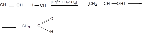 Атом гідрогену гідроксильної групи, набуваючи підвищеного позитивного заряду, легко відкривається у вигляді протона, який приєднується до атома карбону CH2 - групи, що має надлишок електронної густини. У результаті реакції утворюється сполука з карбонільною групою, а із ацетилену при гідратації оцтовий альдегід