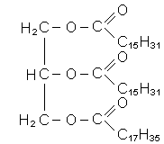 i вищих карбонових кислот, серед яких переважають пальмiтинова C15H31COOH, стеаринова C17H35COOH, олеїнова C17H33COOH або CH3(CH2)7CH=CH(CH2)7COOH кислоти. Жири називають, використовуючи звичайну номенклатуру складних ефiрiв або називаючи тiльки залишки кислот, i додають до останнього залишку закiнчення "-ин" ("-ін"): При лужному гiдролiзi жирiв утворюється глiцерин i мило - сiль вищої кислоти: стеарат натрiю.
