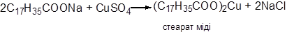 У пробiрку вносять 2 краплi розчину мила, краплю розчину хлориду кальцiю i перемiшують. Випадає бiлий осад. Хiмiзм процесу: 2С17H35COONa + CaCl2 Û (C17H35COO)2Ca + 2NaCl стеарат кальцію Кальцiєвi солi жирних кислот нерозчиннi у водi.